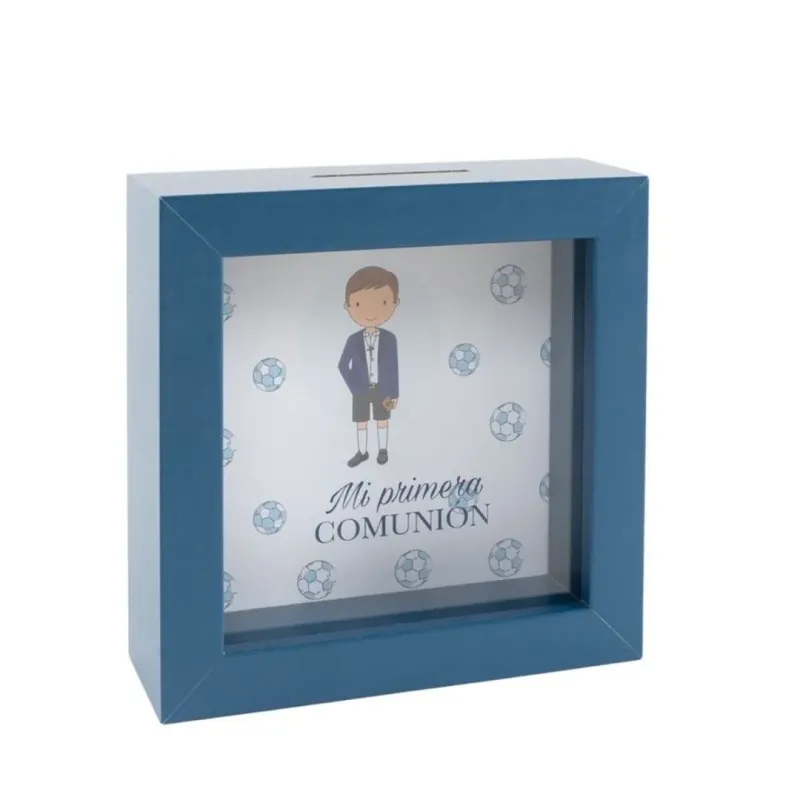 Esta bonita hucha de madera y cristal es el regalo perfecto para celebrar y recordar un día tan importante como su Primera Comunión. Con un diseño infantil y tierno, en tonos azules, y decorada con un dibujo de un niño de comunión y pequeños balones de fútbol, es ideal para que guarde sus primeros ahorros de una manera divertida.